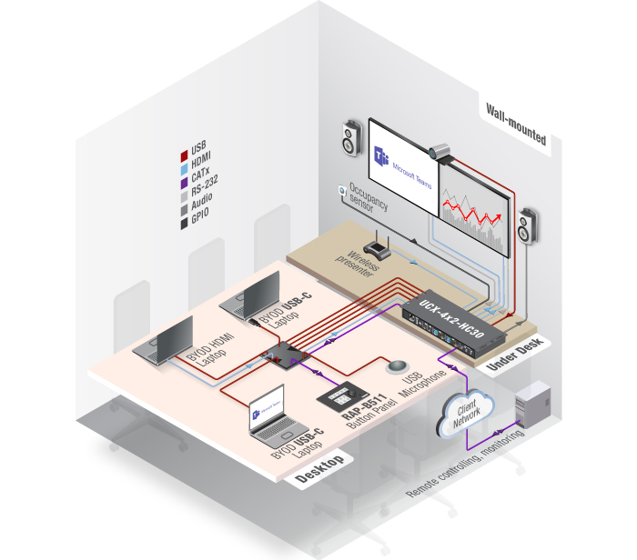 Taurus UCX can also be integrated with room controls, including lights and shades, without the hassle of a separate control system. Simply use the control panel or touchpad that is already used for the room’s video conferencing system.
